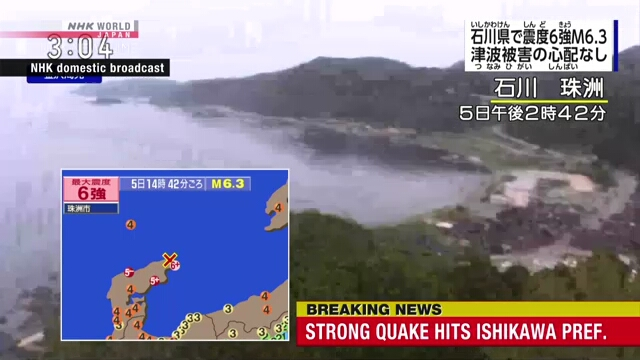 A magnitude 6.3 earthquake, which measured a strong 6 on the shindo (intensity) scale, was detected at a depth of 10 kilometers in Ishikawa Prefecture on Friday at 2:42 p.m.